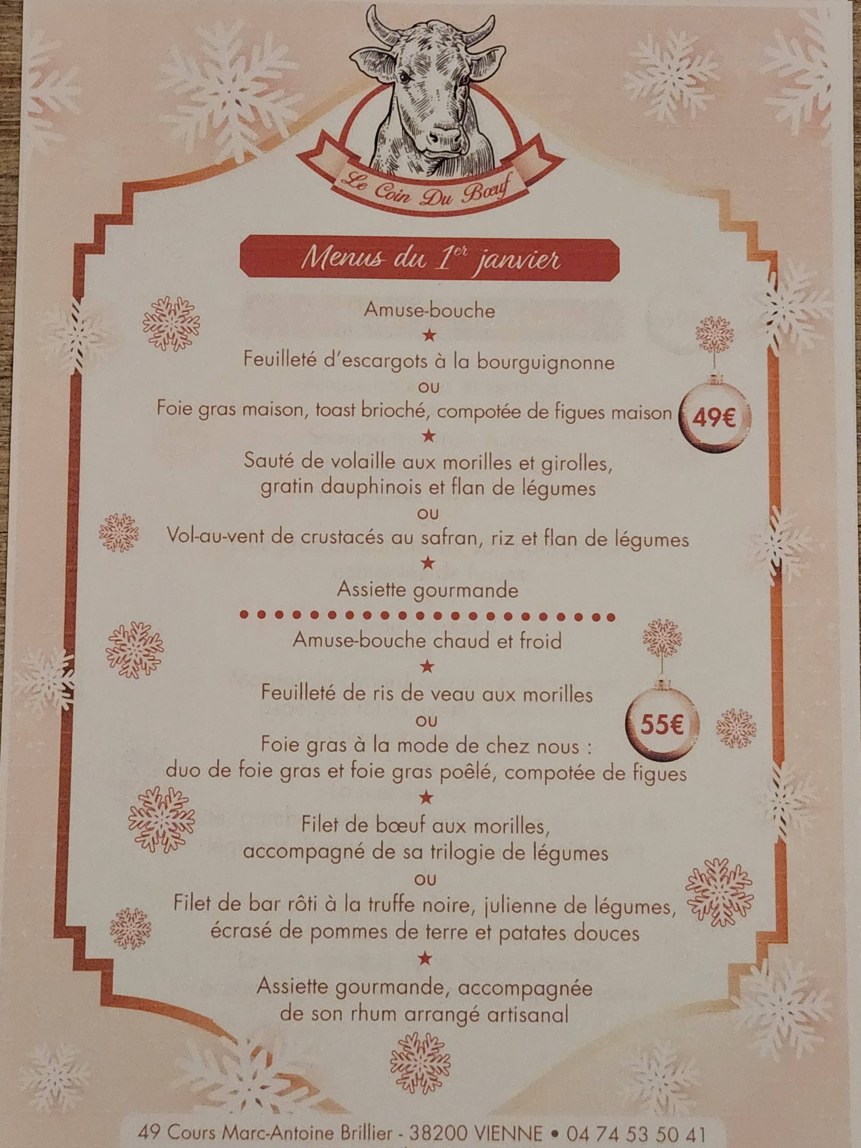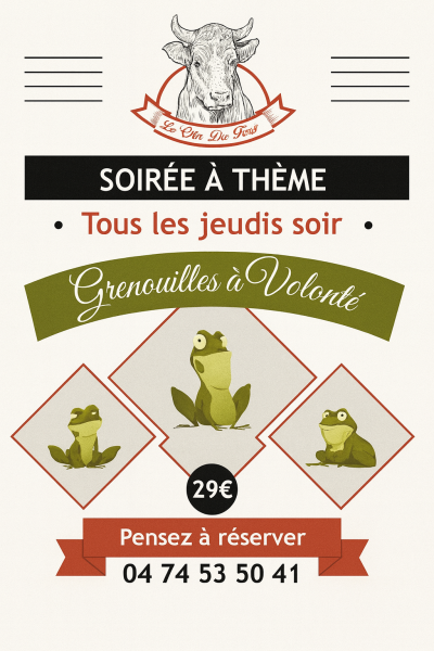 Le Coin du Bœuf fait partie des restaurants Vienne France où l’on ne s’ennuie jamais. Soirées grenouilles à volonté chaque jeudi, dégustations de vins, menus de fête et événements gourmands rythment la vie du restaurant tout au long de l’année. Entre amis, en famille ou entre collègues, chaque moment devient un prétexte à bien manger et bien vivre, au cœur d’une ville riche de culture et de convivialité.